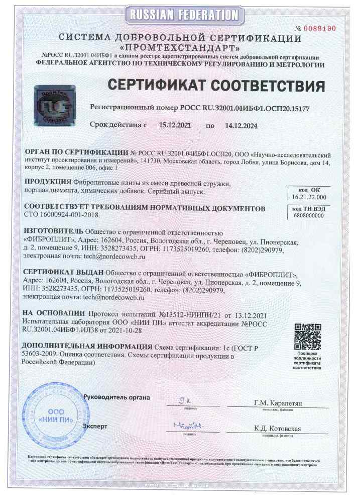 Фибролитовая плита Nordeco ФП 570-15Б 1200х600х15 повышенной плотности на белом цементе